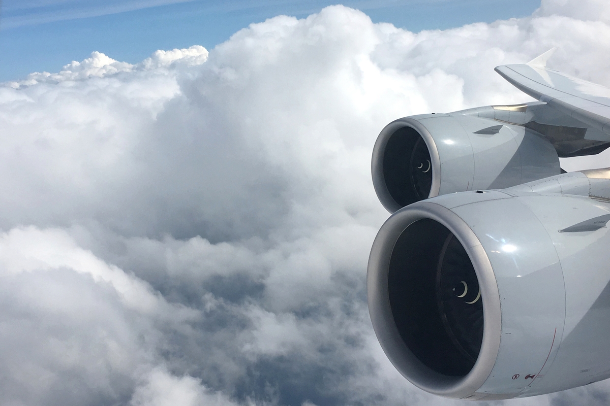 Blick auf die Tragefläche nach dem Start vom Flughafen Houston George Bush Intercontinental des Lufthansa Airbus A380-841 D-AIMJ (Taufname: Brüssel) am 25.04.2018.