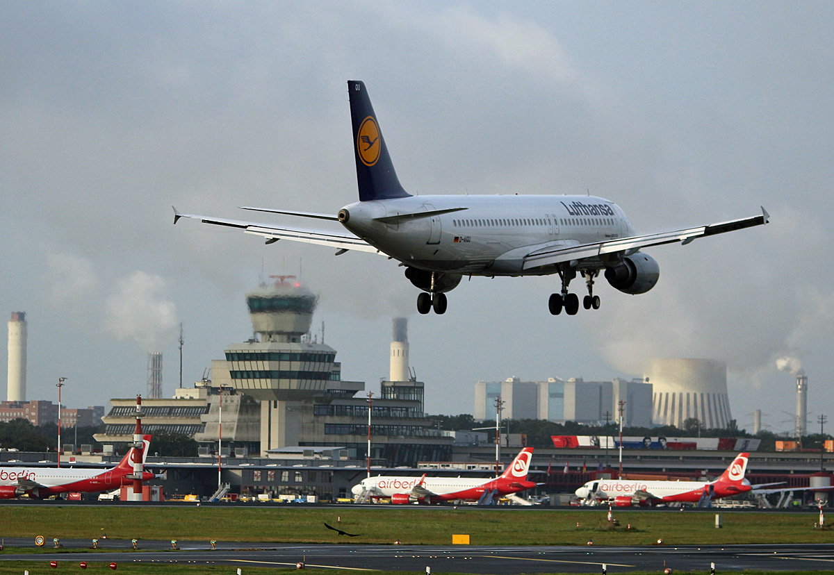 Lufthansa A 320-211 D-AIQU bei der Landung in Berlin-Tegel am frühen Morgen des 08.02.2015