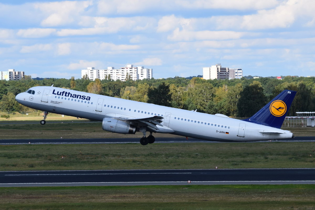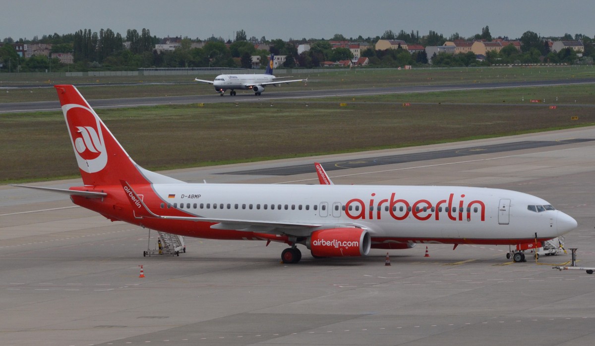 Boeing 737-800 von Air Berlin fertig zum Start am 10.05.15 Flughafen Berlin-Tegel bereit. Im Hintergrund nimmt der Airbus A321-100 D-AIRN ,,Kaiserslautern`` der Lufthansa gerade Anlauf zum Start. M. Schiebel