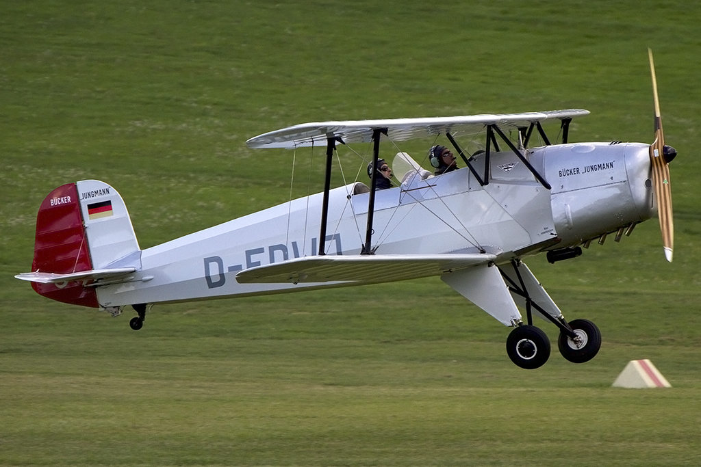 Private Bücker Bü-131C (Casa) D-EDWJ bei der Landung auf dem Flugplatz Bautzen während der sächsischen Flugtage am 10.08.2013
