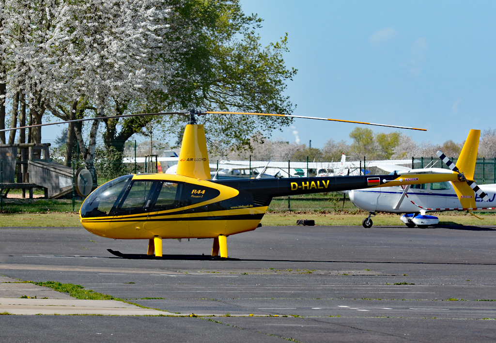 R 44 Raven I, D-HALV der Firma Air Lloyd in Bonn-Hangelar. Auslösung der Kamera und Blitz des Strobelights auf dem Tailboom zufällig im gleichen Moment. 12.02.2014 Rolf Reinhardt