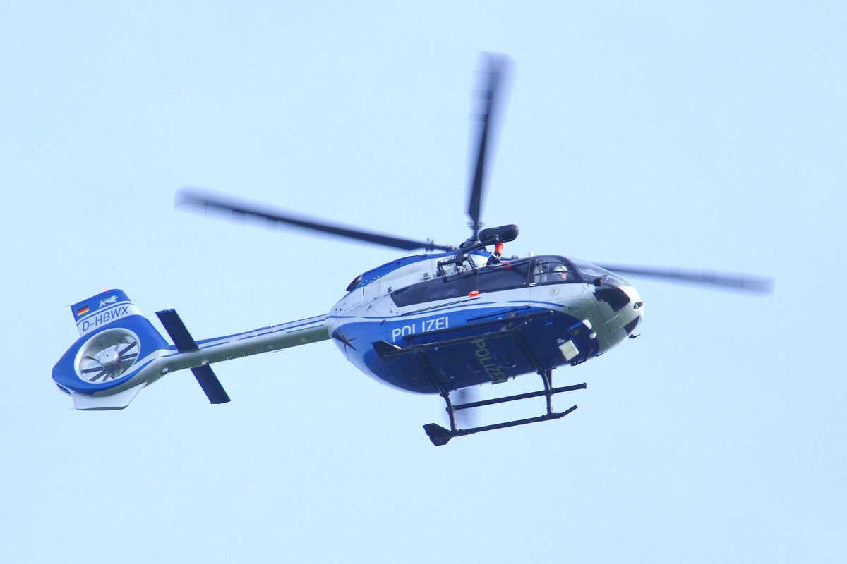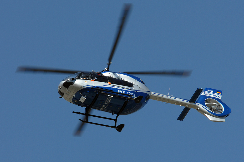 Ein Polizeihubschrauber H145, Kennung D-HBWX der Baden-Württembergischen Landespolizei, gesehen am 4.10.17 bei Oppenweiler, der Richtung Backnang flog.