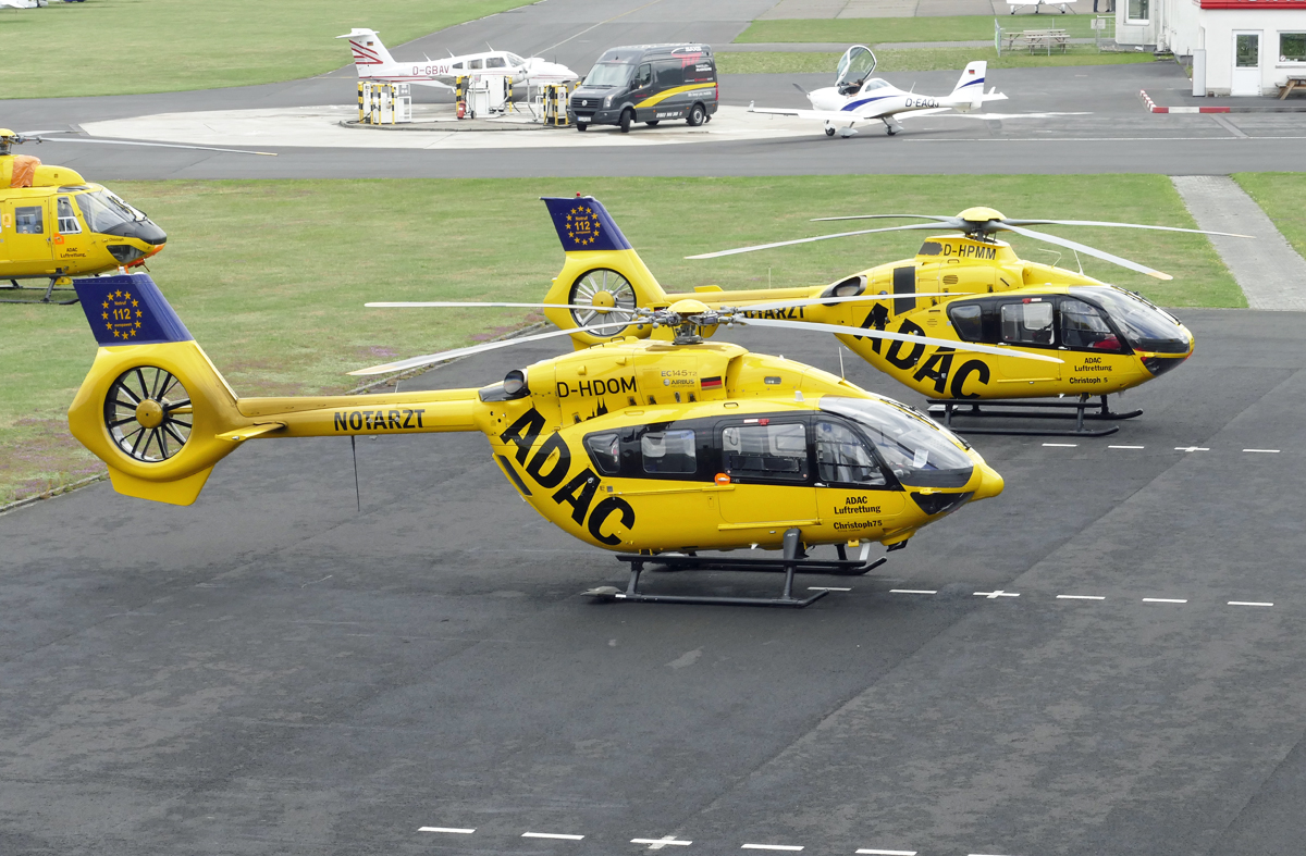 H 145 D-HDOM und EC 135P-2 D-HPMM vor der ADAC-Halle in EDKB - 26.07.2017