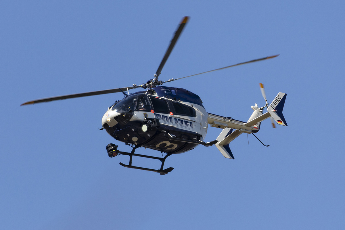 Eurocopter EC-145 mit der Kennung D-HHEC der Polizei aus Frankfurt am Main beim Überflug über die A5 neben dem Frankfurter Flughafen