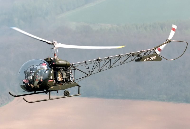AgustaBell 47 G-2, D-HOPS, mit schön durchgebogenen Holzrotorblättern - Sommer 1974.
