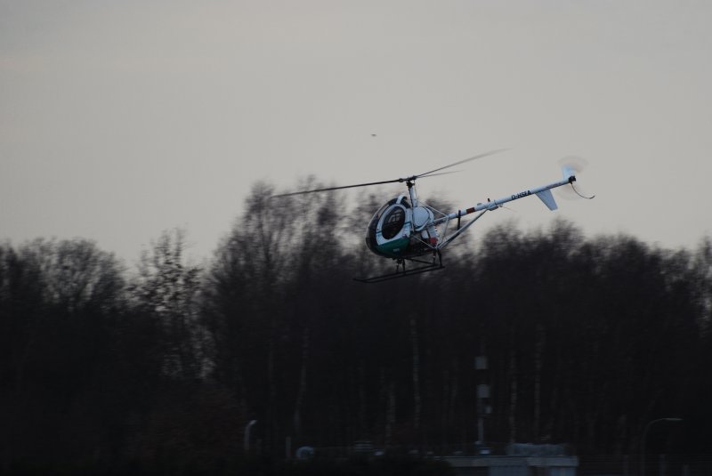 Der Hughes 300C D-HSEA fliegt am 14.03.09 über die Runway des Flughafens Hamburg Fuhlsbüttel.