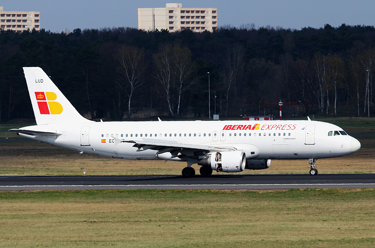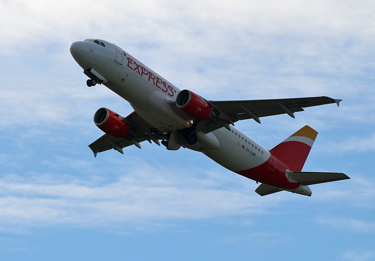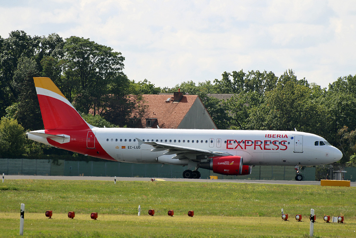 Einer von 15 Airbus A 320-200 (Kennung: EC-LUD) der 2011 gegründeten spanischen Billigfluggesellschaft Iberia Express am 24.7.14 auf dem Düsseldorfer Flughafen Marvin B.