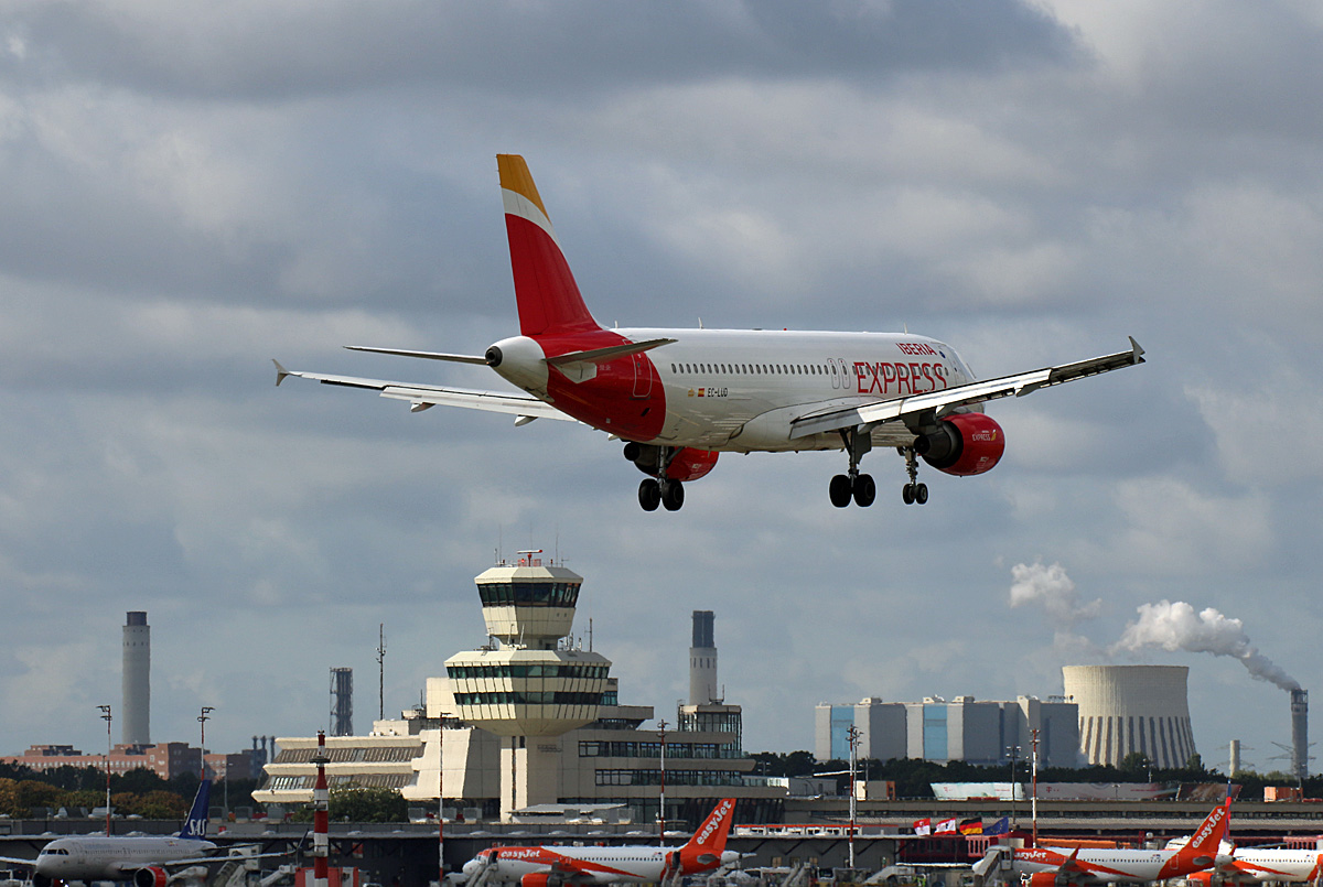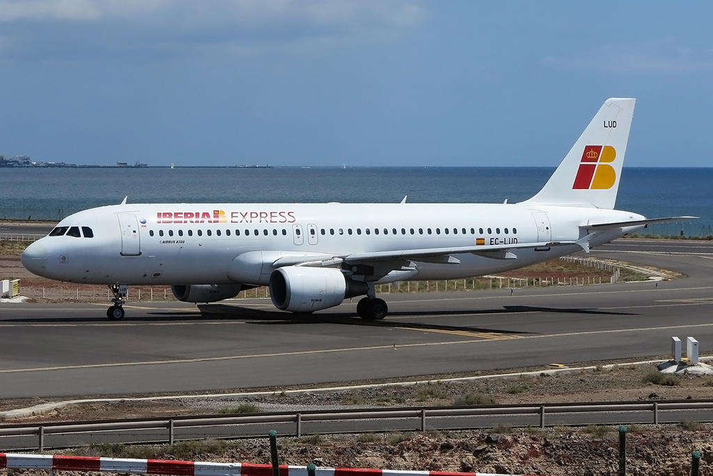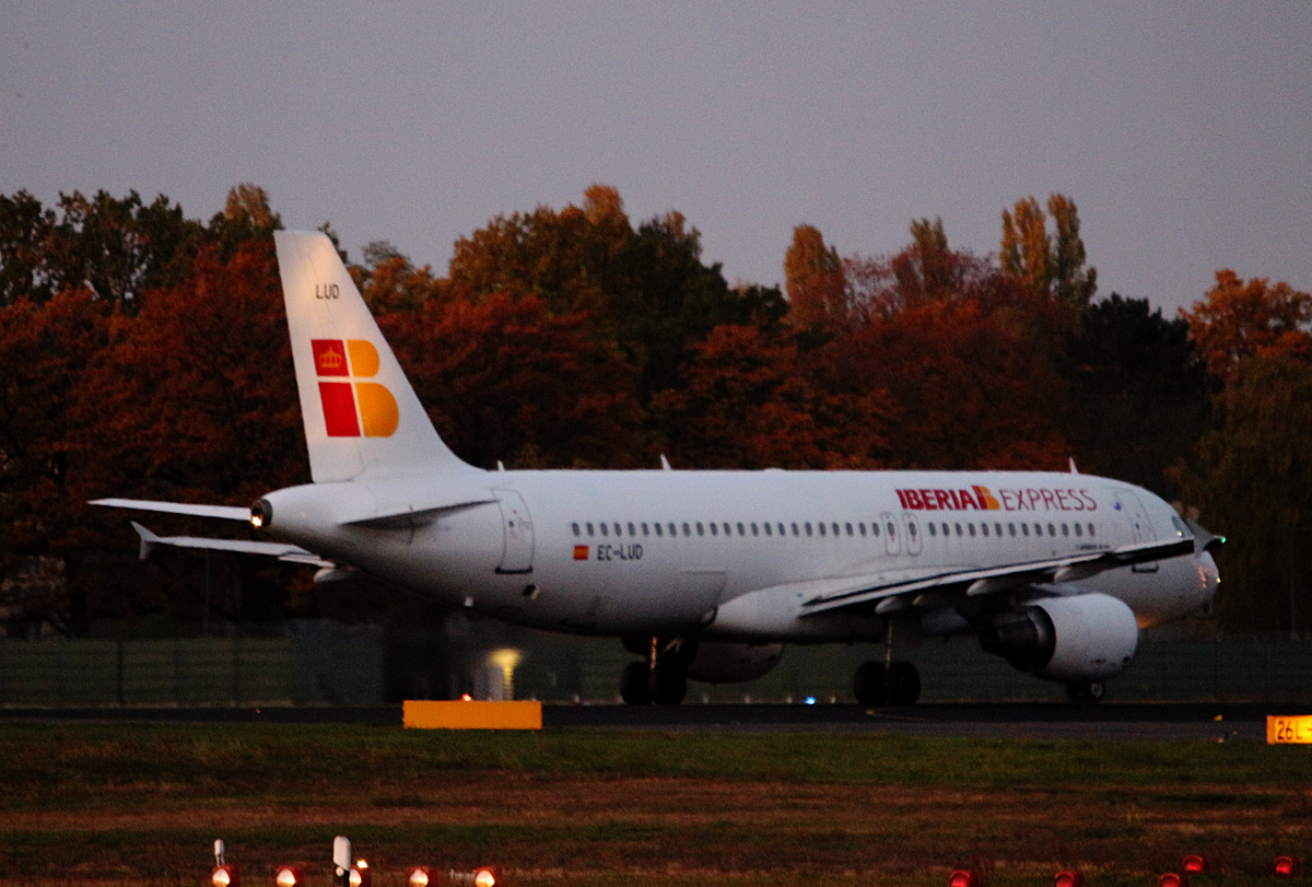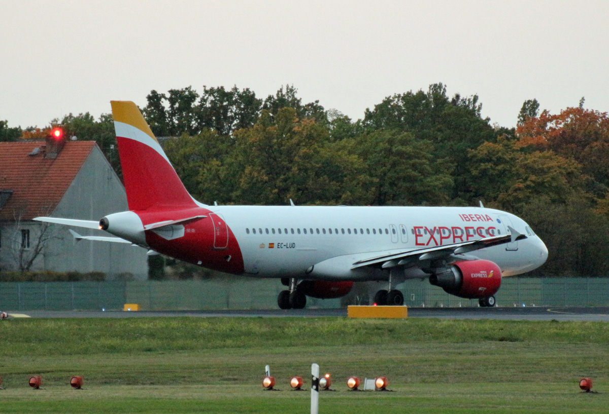 Einer von 15 Airbus A 320-200 (Kennung: EC-LUD) der 2011 gegründeten spanischen Billigfluggesellschaft Iberia Express am 24.7.14 auf dem Düsseldorfer Flughafen Marvin B.