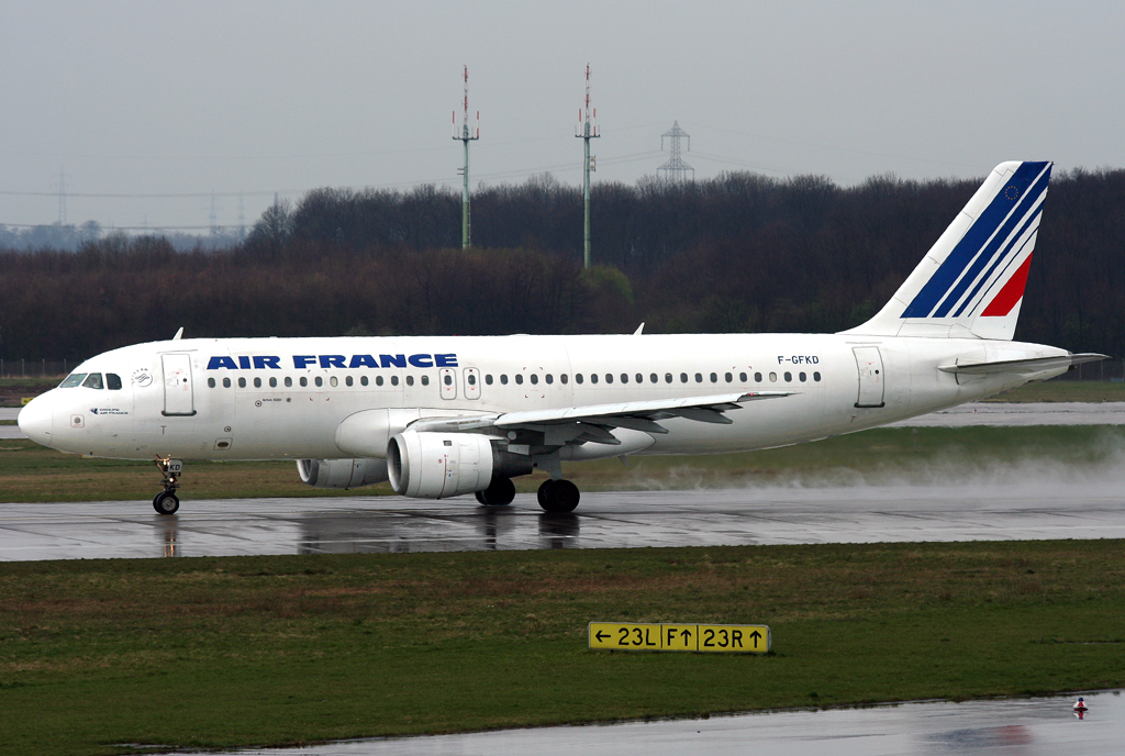 Airbus A320 F-GFKD bei der Landung auf der 05L. Das Licht war am Abend sehr merkwürdig. Mal düster, dann brach die Sonne hervor, dann wurde es diesig, dann wieder hell... Das Foto stammt vom 09.07.2007 Martin Kramer