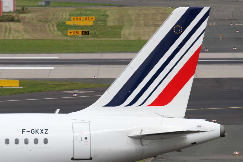 Air France, F-GKXZ, Airbus, A 320-200 (Seitenleitwerk/Tail ~ neue AF-Lkrg.), 11.08.2012, DUS-EDDL, Düsseldorf, Germany