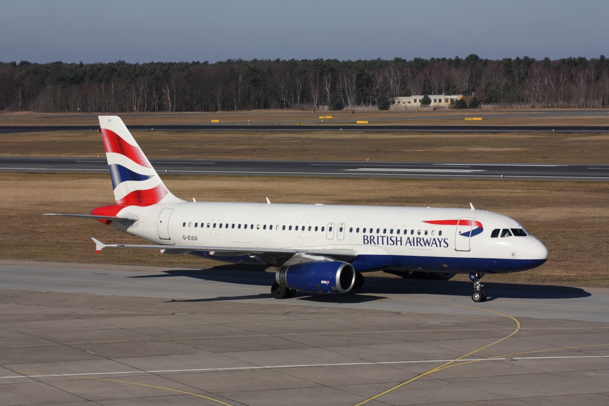 A320 der British Airways (G-EUUI) rollt in Berlin-Tegel zu seiner Parkposition. Fotografiert am 23.02.2014.