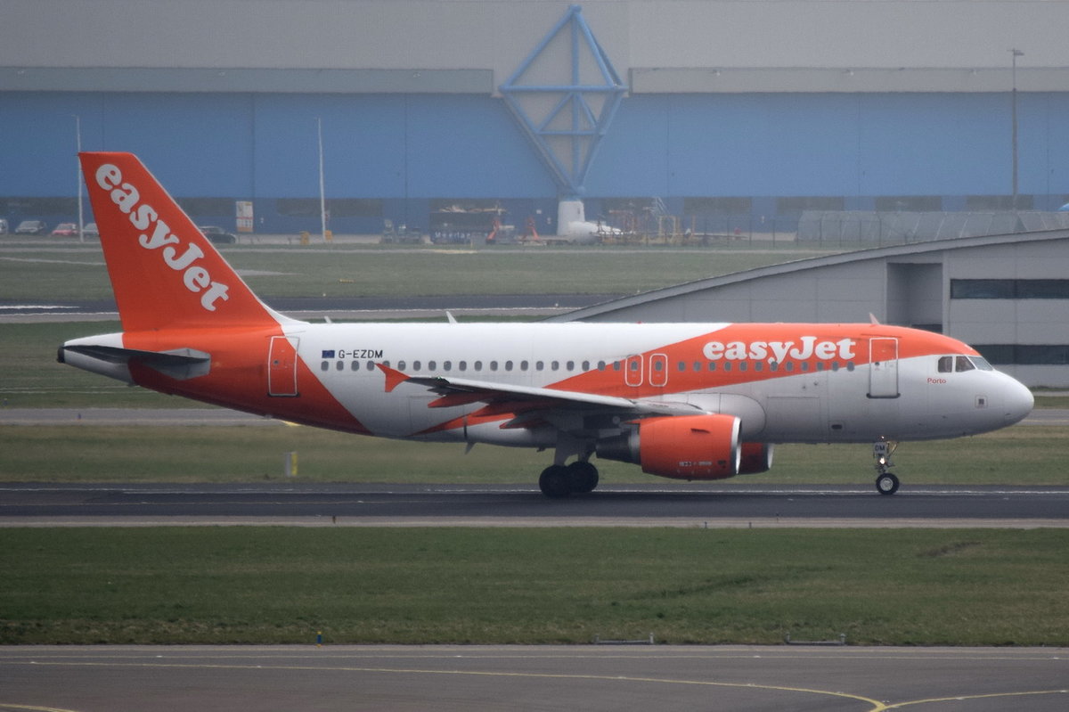 easyJet, G-EZDM Airbus A319-111, AMS  Amsterdam, Netherlands. Mit Sticker Porto.