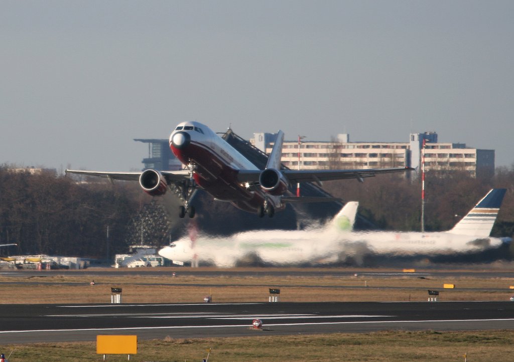 Air Berlin (Belair) A 320-214 HB-IOU beim Start in Berlin-Tegel am 12.02.2011