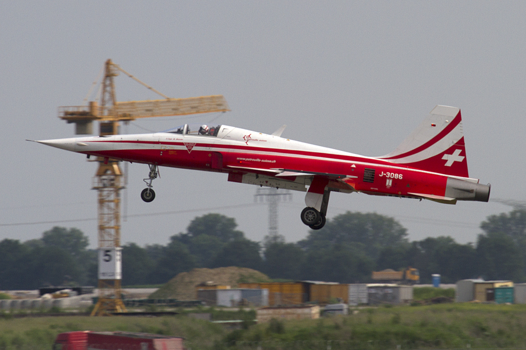 Landung nach dem Flugdisplay Patrouille Suisse Northrop F5-Tiger II J-3086 aufgenommen auf der ILA am 04.06.16