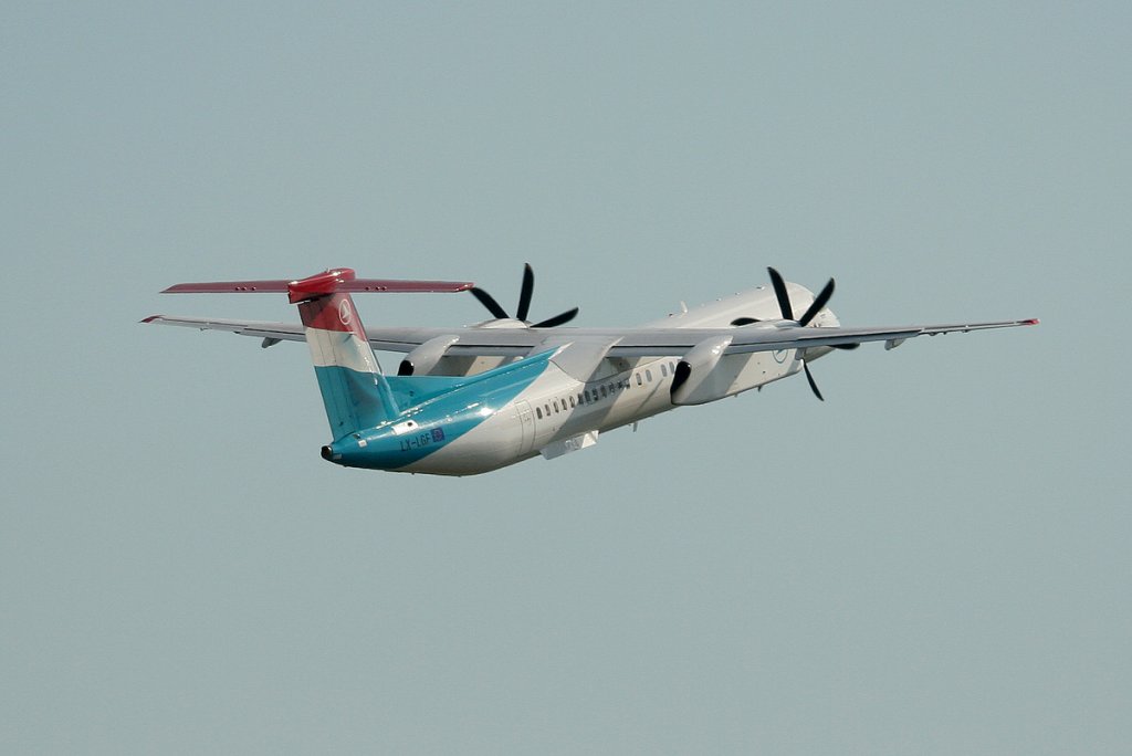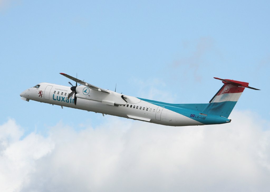 Luxair De Havilland Canada DHC-8-402Q LX-LGF beim Start in Berlin-Tegel am 22.05.2012