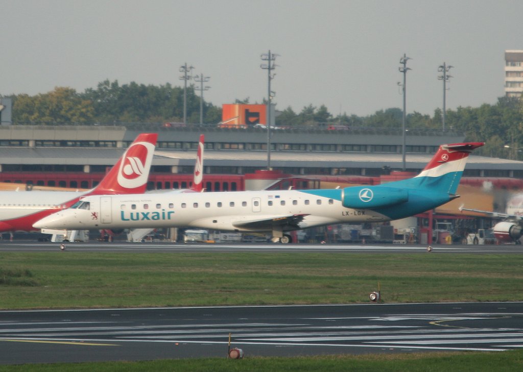 Luxair Embraer ERJ-145 LX-LGX kurz vor dem Start in Berlin-Tegel am 04.10.2011