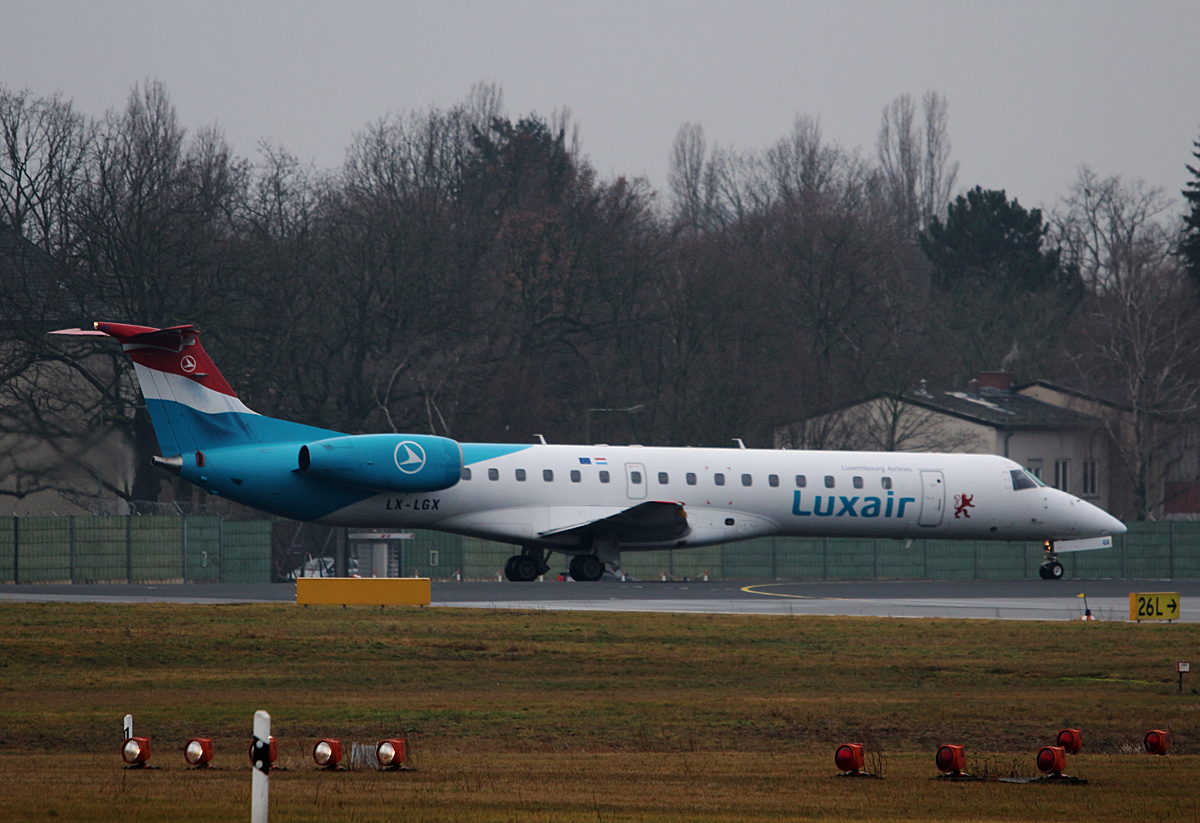 Luxair ERJ-145LU LX-LGX kurz vor dem Start in Berlin-Tegel am 05.02.2016