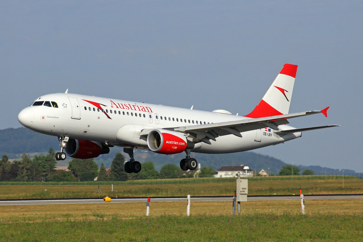Blick von der Besucherterrasse des Flughafens Wien auf die Angedockten Flugzeuge der Austian Airlines um die Passagiere aufzunemmen oder aussteigen zu lassen. Im Vordergrund die OE-LBY Airbus A 320 – 214 der Austrian Airlines. 06.2023 De Rond Hans und Jeanny
