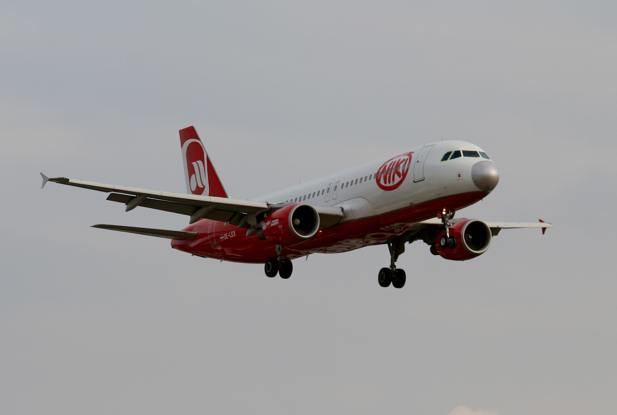 AB 3255 von Mallorca nach Friedrichshafen, der Airbus A320 von Niki beim Landeanflug auf runway 24 in Friedrichshafen, Re.: OE-LEX (31.07.2012)