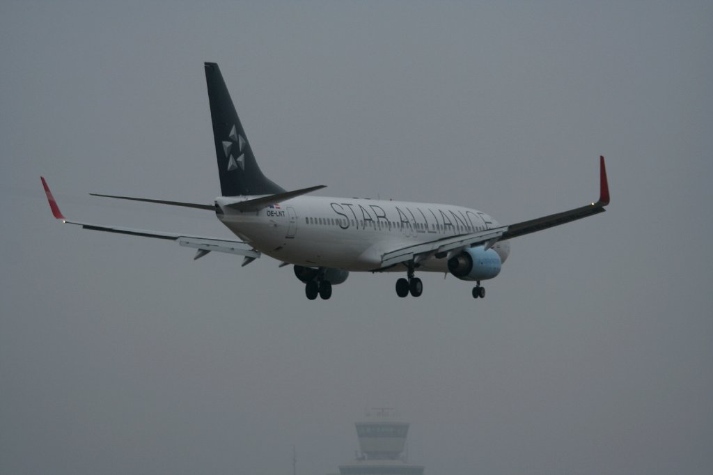 Berlin-Tegel im Nebel. Austrian B 737-8Z9 OE-LNT bei der Landung am 20.03.2011