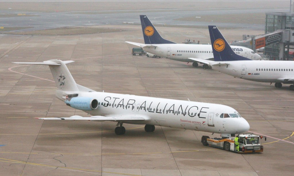 Austrian Star Alliance F100 OE-LVG beim Start auf der 23L in DUS / EDDL / Düsseldorf am 07.08.2008