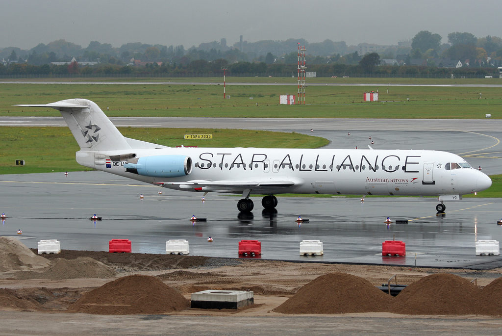 Austrian Arrows Star Alliance F-100 OE-LVG rollt zur 23L in DUS / EDDL / Düsseldorf am 08.10.2008