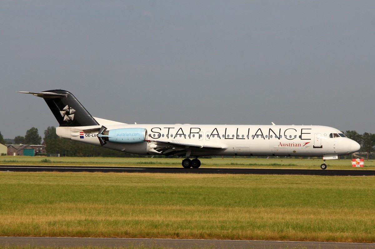 Austrian Airlines, OE-LVG, Fokker 100, 5.Juli 2015, "Krakow", AMS Amsterdam, Netherlands. Star Alliance Bemalung.
