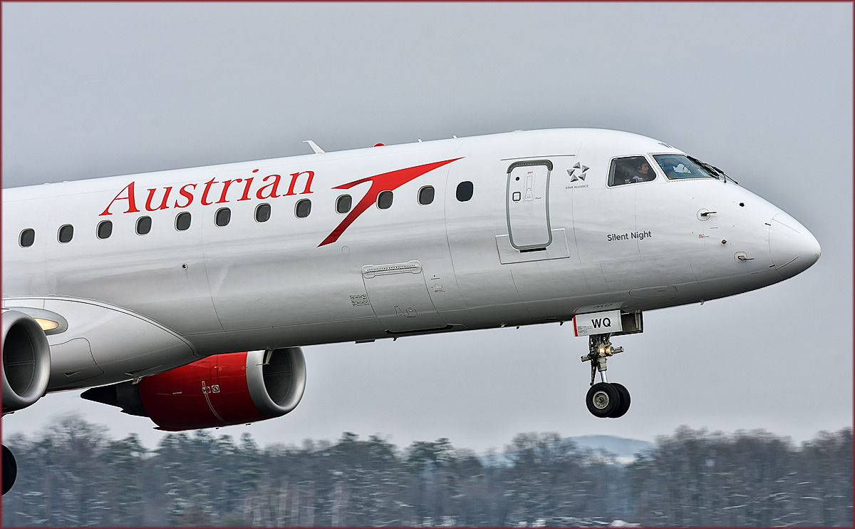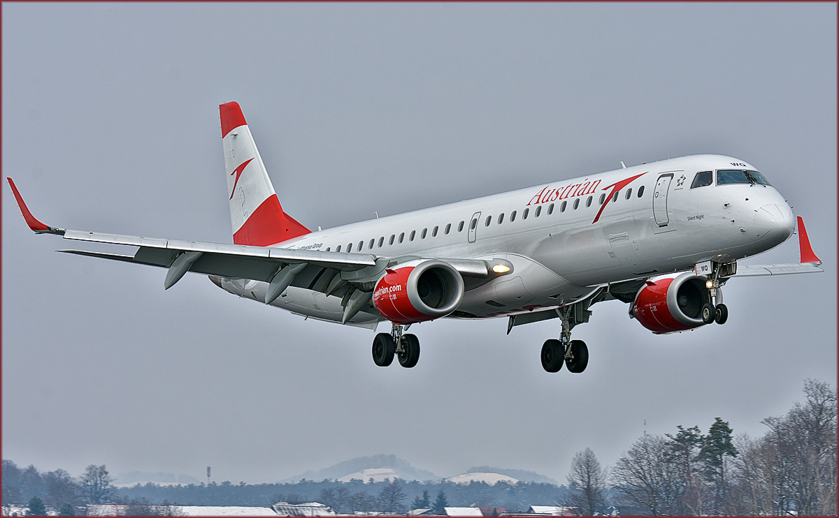 OE-LWQ  Silent Night  (Embraer E195LR) der Austrian Airlines hat am 05.01.2025 Innsbruck-Kranebitten als OS 905 aus Wien erreicht.