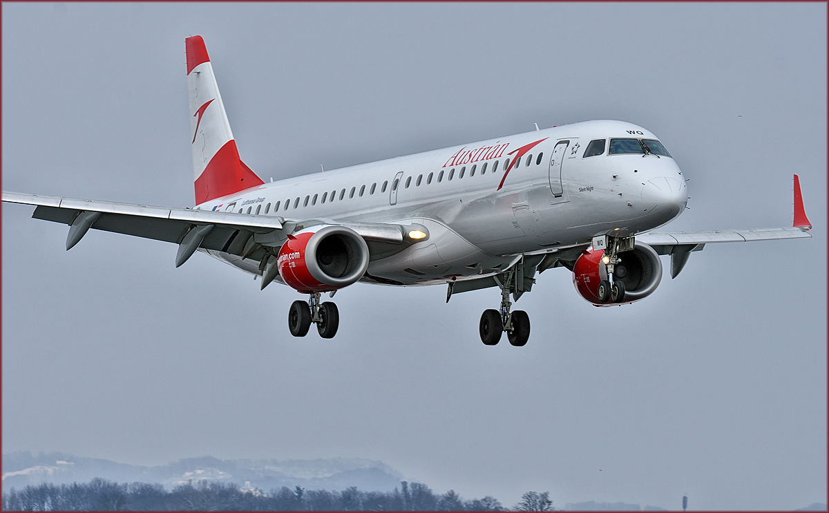 OE-LWQ "Silent Night" (Embraer E195LR) der Austrian Airlines hat am 05.01.2025 Innsbruck-Kranebitten als OS 905 aus Wien erreicht.