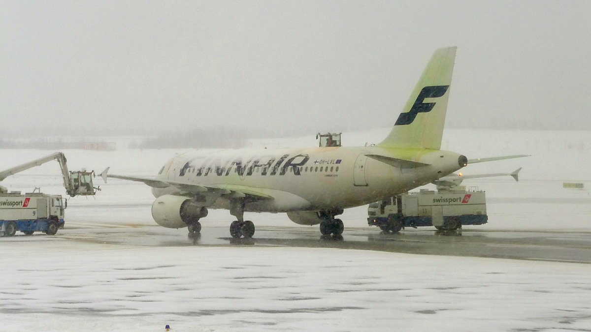 Finnair A319, OH-LVL, beim Enteisen am Flughafen Helsinki-Vantaa, 4.3.13