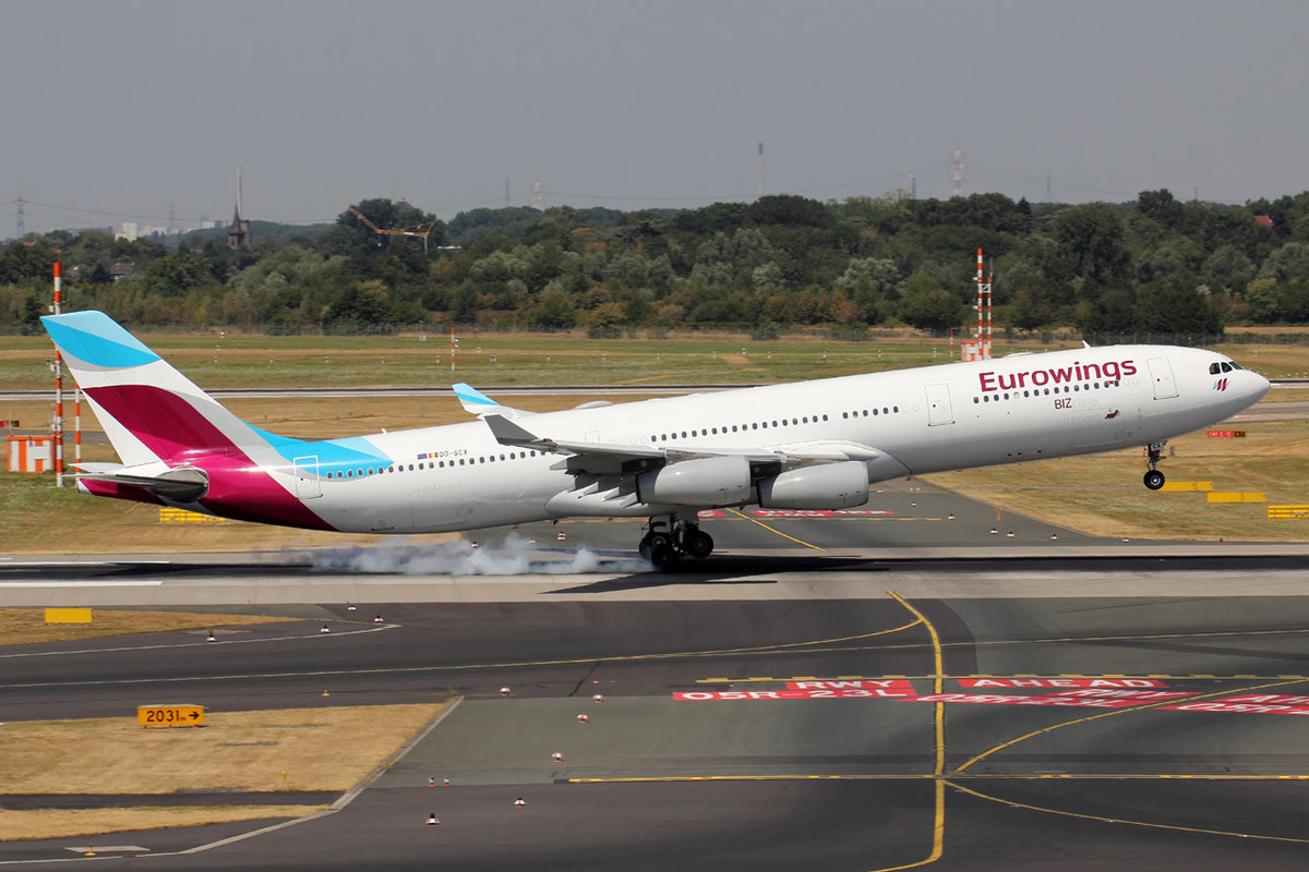 Eurowings Airbus A340-313X OO-SCX bei der Landung in Düsseldorf 27.7.2018