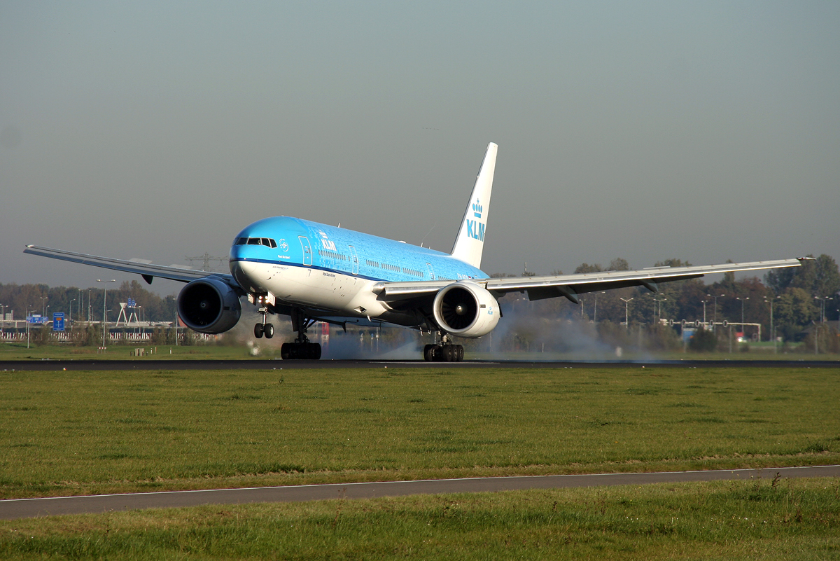 KLM B777-200 Delf Blue PH-BQP beim Touchdown auf 18R in AMS / EHAM / Amsterdam am 15.10.2011