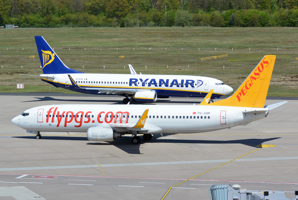 B 737-800 2 x, Ryanair EI-FRH und Pegasus TC-ADP, Begegnung auf dem Rollweg in CGN - 05.05.2016