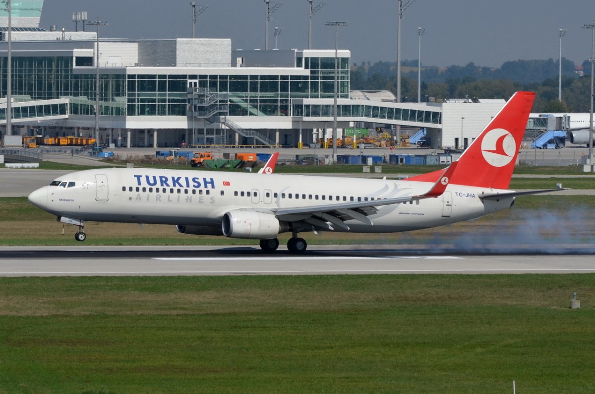 TC-JHA Turkish Airlines Boeing 737-8F2(WL) bei der Landung in München am 11.09.2015