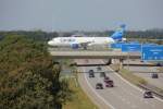 einmal ein etwas anderes Flugzeugbild. Interessant der die Autobahnüberquerende Airbus der Condor mit dem hellblauen Leitwerk und die ebenfalls hellblauen Autobahnhinweisschilder.