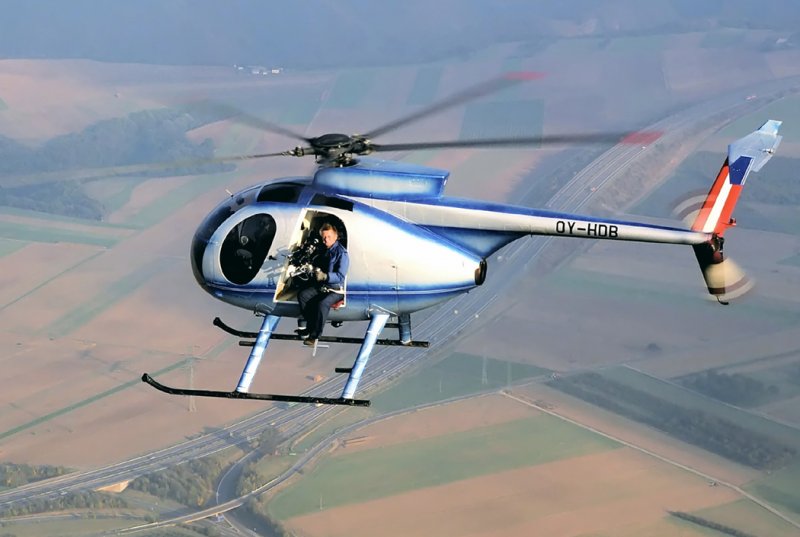 Hughes 500 D - luftiger Arbeitsplatz - bei Filmaufnahmen für Werbefilm - Kennzeichen DK OY-HDB - 27.10.1983.(zum Bild)