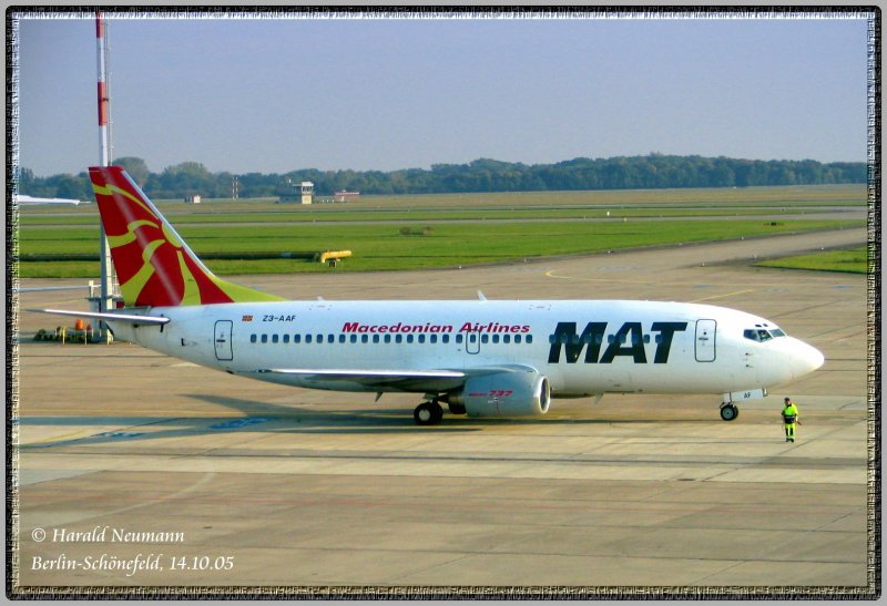 Eine Boeing 737-800 der Macedonien Airlines in Flughafen Schönefeld. 14.10.05