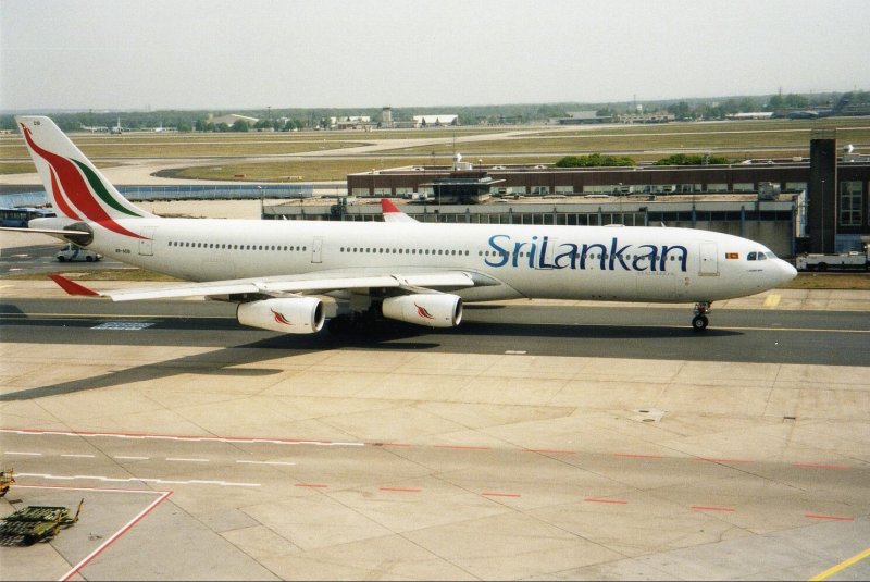 Hier ist ein Airbus A340-300 der Fluggesellschaft Sri Lakan zu sehen, der gerade in Frankfurt gelandet ist (gescanntes Bild)