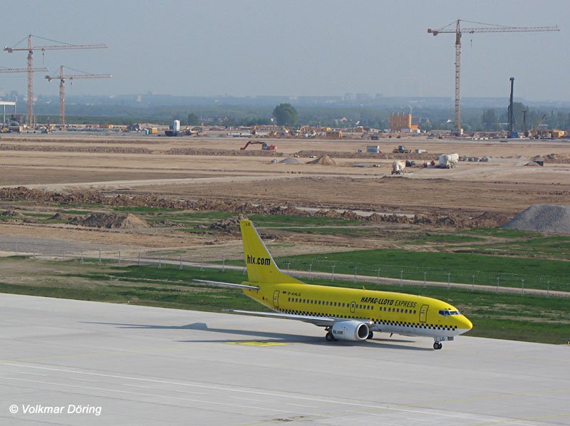 Soeben gelandet ist die Boeing 737 HAPAG-LLOYD EXPRESS in Leipzig/Halle, 07.05.2006