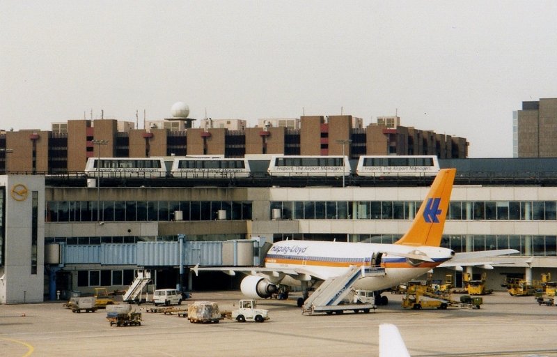 Das Terminal 2 der Frankfurter Flughafen wurde 1994 in Betrieb genommen. Die Verbindung zum Terminal 1 stellt der sogenannten Sky Train her. Diese vollautomatische Bahn fährt auf Gummireifen. In Bildmitte ist ein solcher Zug am dortigen Bahnsteig stehend erkennbar. 1.6.2006 (Matthias)