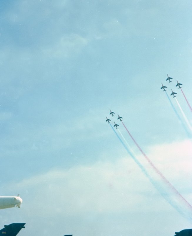 Eine Kunstflugstaffel der "Patrouille de France" überfliegt uns mit ohrenbetäubenden Lärm in ca. 50 m Höhe. (Alpha Jet)