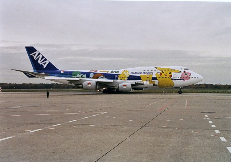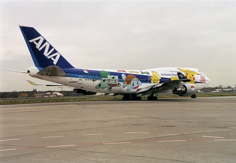 All Nippon Airways, JA8962, Boeing 747-481. Der Pokemon-Jumbo hat sich nicht verirrt, sondern er holte die Berliner Philharmoniker zu einer Gastspielreise in Japan ab. Tegel 90er Jahre.