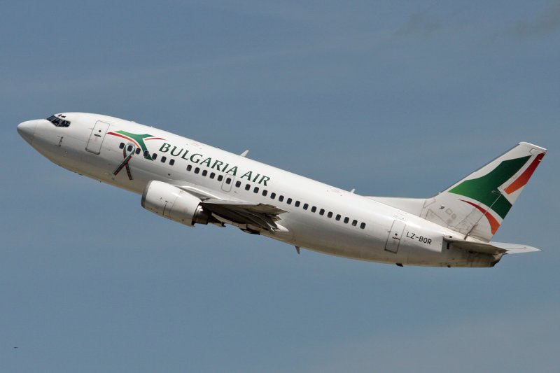 Bulgaria Air, Boeing 737-548 kurz nach dem Start auf Rwy 28. Mit einer Schleife auf den Flugzeugen macht Bulgaria Air auf die in Libyen festgehaltenen Krankenschwestern aufmerksam. 24.6.2007