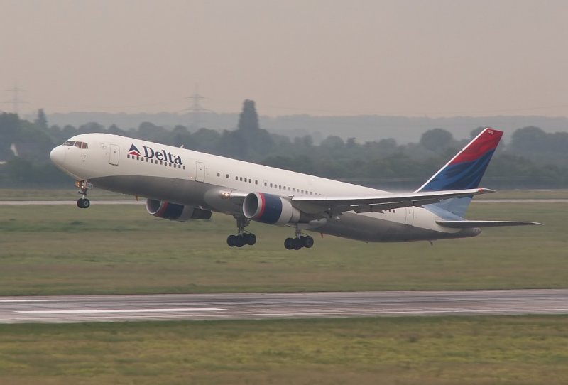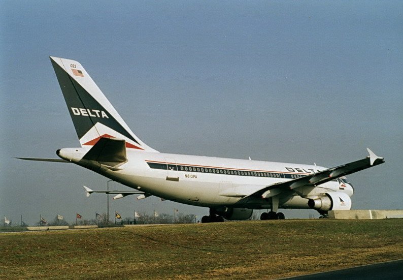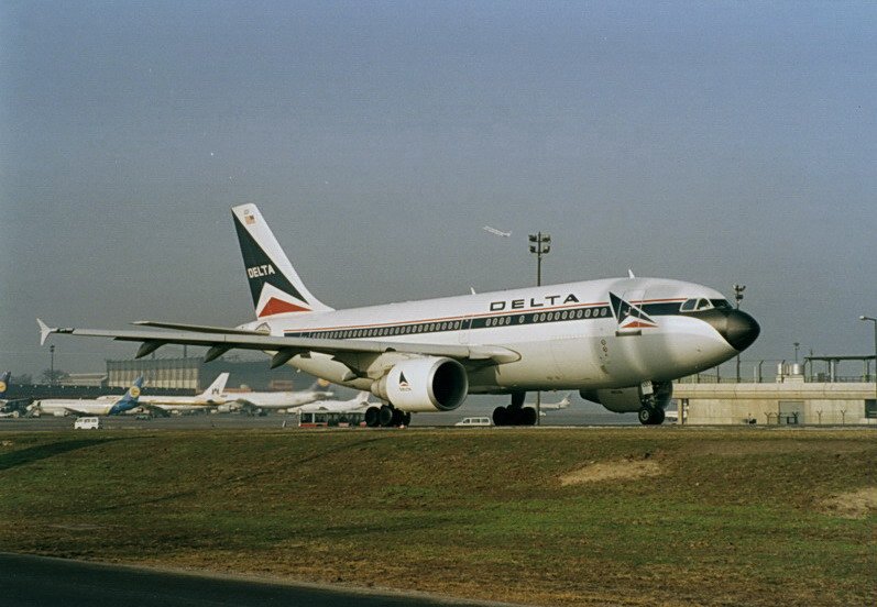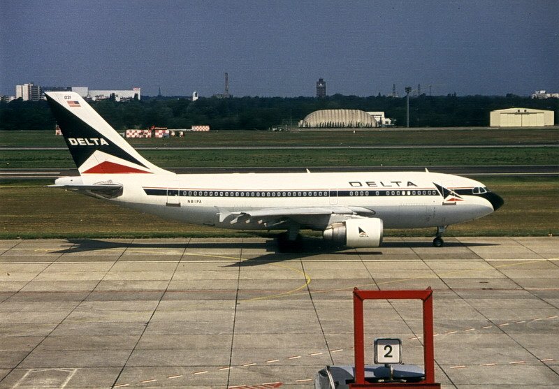 Delta Air Lines, N811PA, Airbus A310-324. Auch diese Maschine gehörte vorher zur PanAm, erkennbar an den beide letzten Buchstaben in der Kennung. Foto von der Zuschauerterrasse in den 90er Jahren.