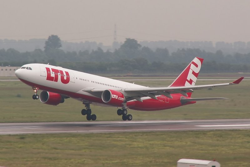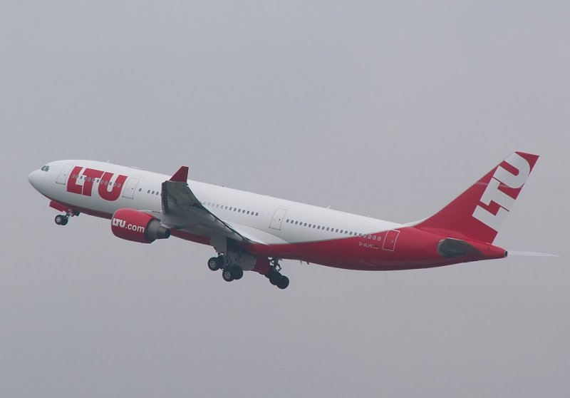 Die D-ALPC schwingt sich in den dunklen Düsseldorfer Himmel. Das ist das neue Erscheinungsbild von LTU. Das Foto stammt vom 31.05.2007