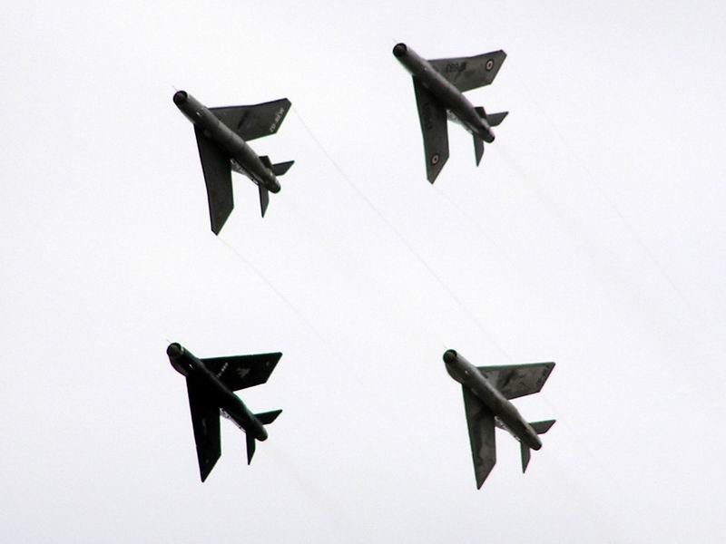 Englische Electric „Lightning“ im Formationsflug. Interessant deshalb, da es sich um die letzten noch fliegenden Exemplare handelt. Stationiert bei dem Internationalen Flughafen Kapstadt. Das letzte Modell, die XP693 wurde erst 2006 wieder hergerichtet und macht somit das vierte Flugzeug aus in der Reihe. Atemberaubend auch deshalb, wenn die Formation der vier Lightning’s den Nachbrenner ausnützen, 2000 Liter Jet A1 Benzin in der Minute verbrauchen und 200000 PS erzeugen. Aufgenommen am 23. September 2006 bei der Luftschau in Kapstadt.