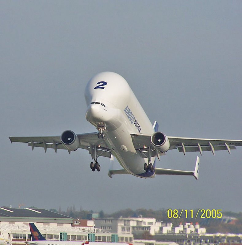 Hier seht ihr eine BELUGA beim starten bei AIRBUS in Hamburg.Mit dem speziellen Transportflugzeug Beluga A300-600ST werden einzelne Sektionen von anderen europäischen Werken herangeschafft