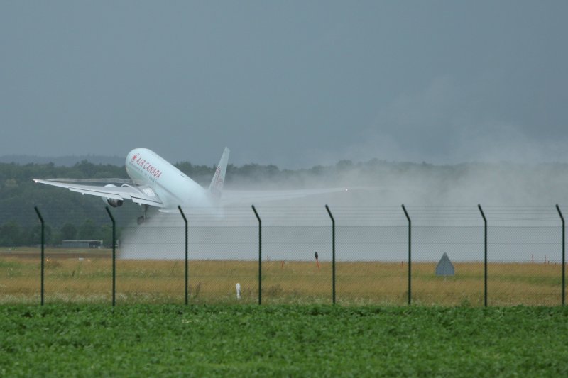 Nach einem gewaltigen Gewitterregen startet die AirCanada B767-300 C-FCAE mit über einer Stunde Verspätung nach Toronto , der Flugbetrieb in ZRH war etwa 30 Minuten lang eingestellt. 21.Juni 2007