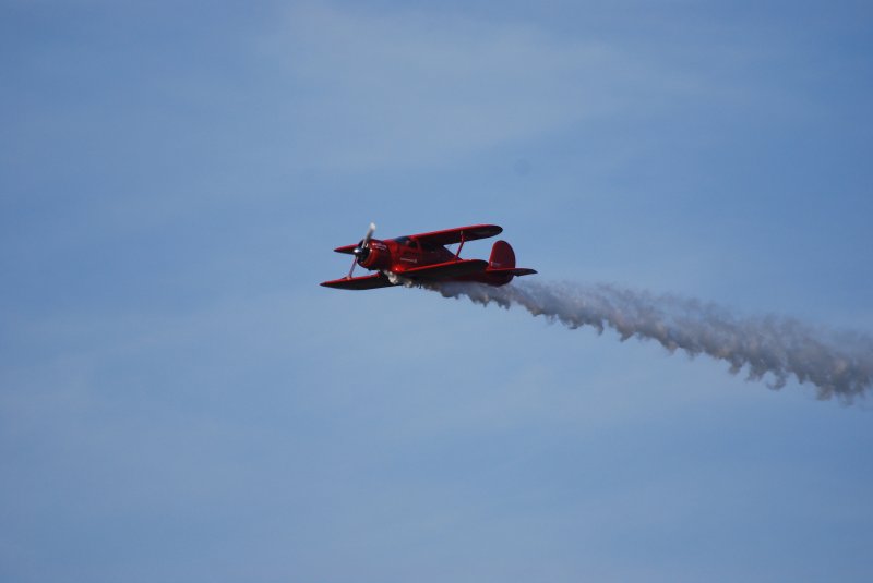 Beech 17 Staggerwing beim Smokeüberflug auf den Flugtagen Lübeck am 27.09.08 auf dem Flughafen Lübeck Blankensee.
