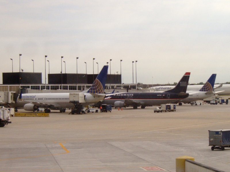 Ein Airbus A 320 der United Airlines in alter Farbgebung an der Gate in Chicago O'Hare am 09.06.2008.